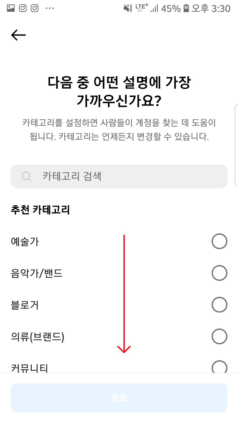 아래로 스크롤하거나 검색을 통해 원하는 직업을 선택해주시고 완료를 눌러주세요.