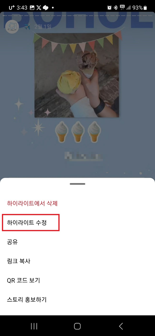 첫번째 순서로 옮기고 싶은 하이라이트를 선택해주고, 우측 하단 더보기를 클릭한 후 하이라이트 수정을 눌러주세요.