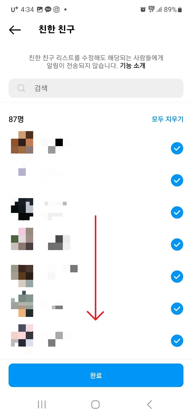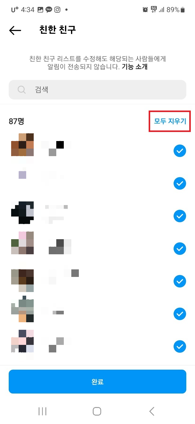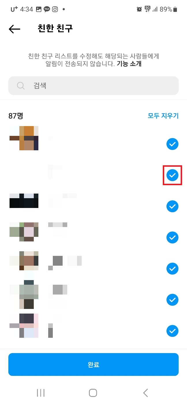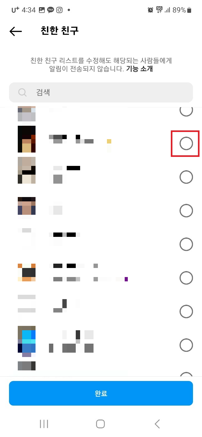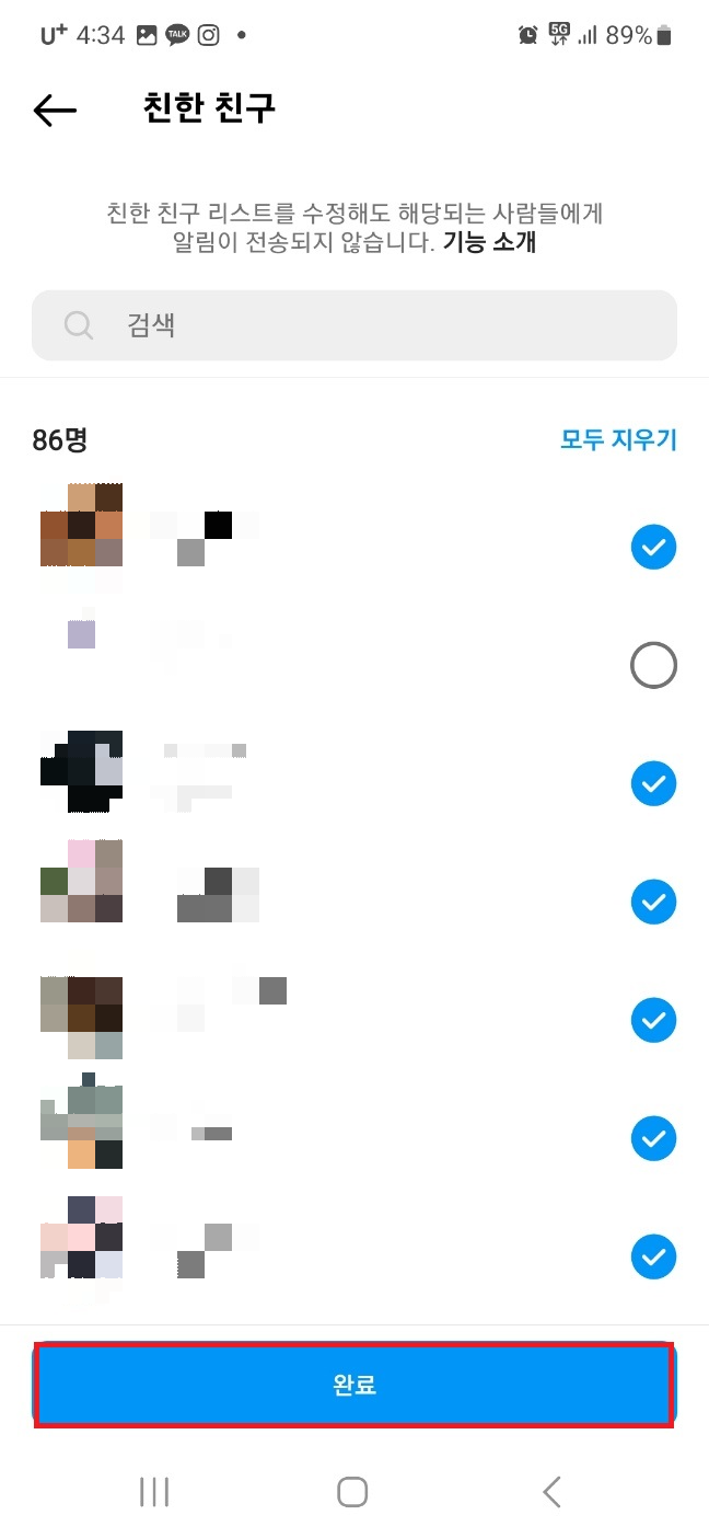 친한친구를 해제하고 싶으시다면, 해제할 계정을 찾아 체크 표시를 눌러 빈 동그라미로 만든 후 완료를 눌러주세요.