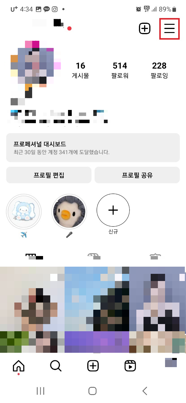 인스타 어플을 실행한 후 우측 하단 프로필을 클릭하여 내 피드로 들어가주세요!
