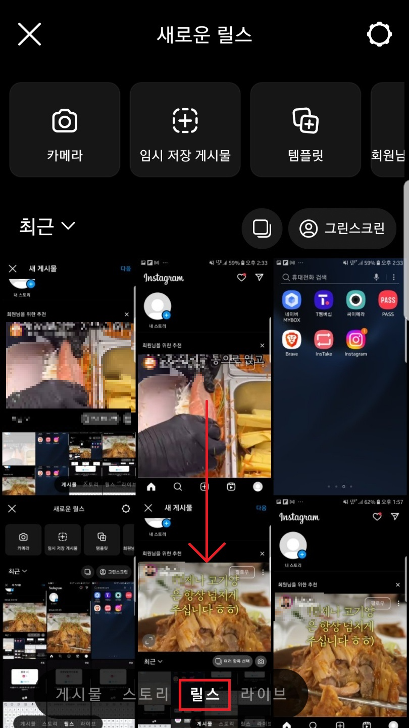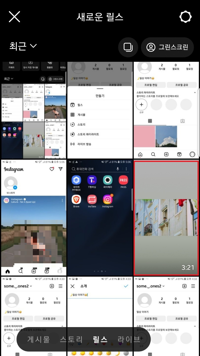 하단 메뉴 중 +버튼을 눌러주시고 하단 탭을 릴스로 바꿔주신 후 아래로 스크롤을 내려 영상을 골라주세요.
