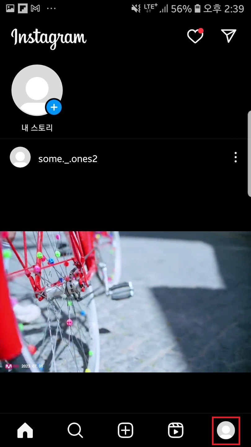인스타를 실행해주시고 우측 하단 프로필을 클릭하여 내 피드에 들어가주세요.