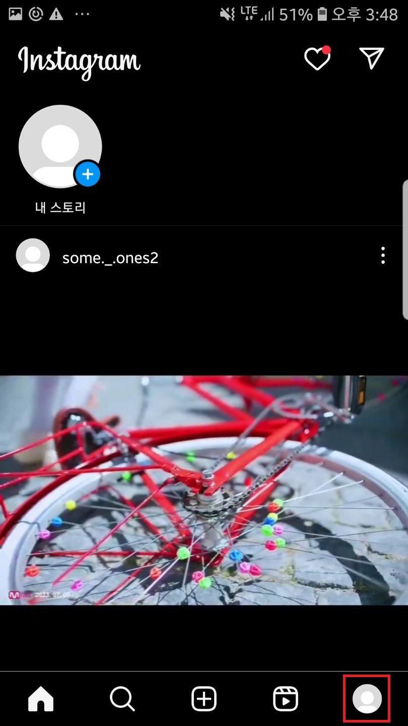 인스타를 실행해주시고 우측 하단 프로필을 클릭해 내 피드로 이동해주세요.