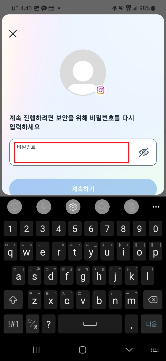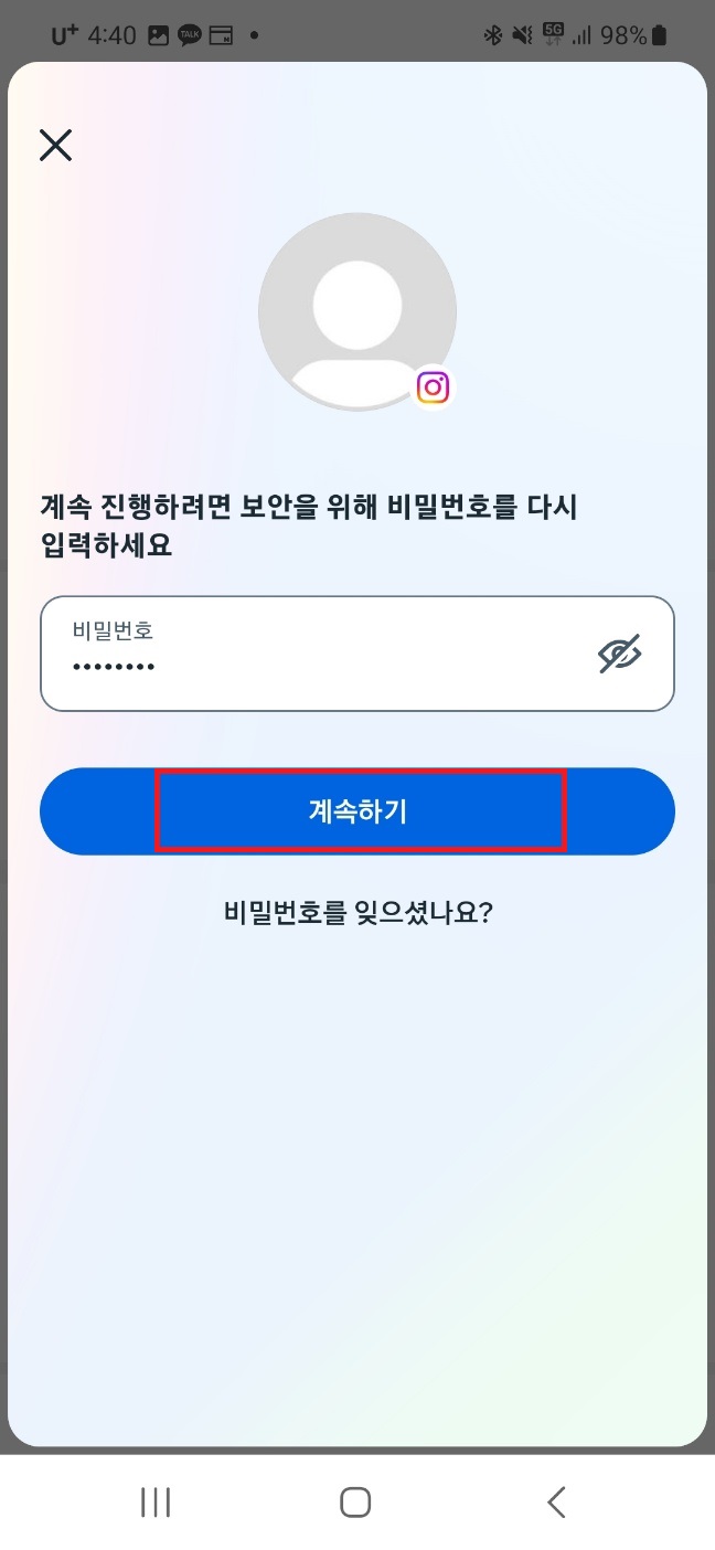 계속을 눌러주시면 비밀번호 입력창이 뜨는데요. 여기서 비밀번호를 입력해주고, 계속하기를 눌러주세요!