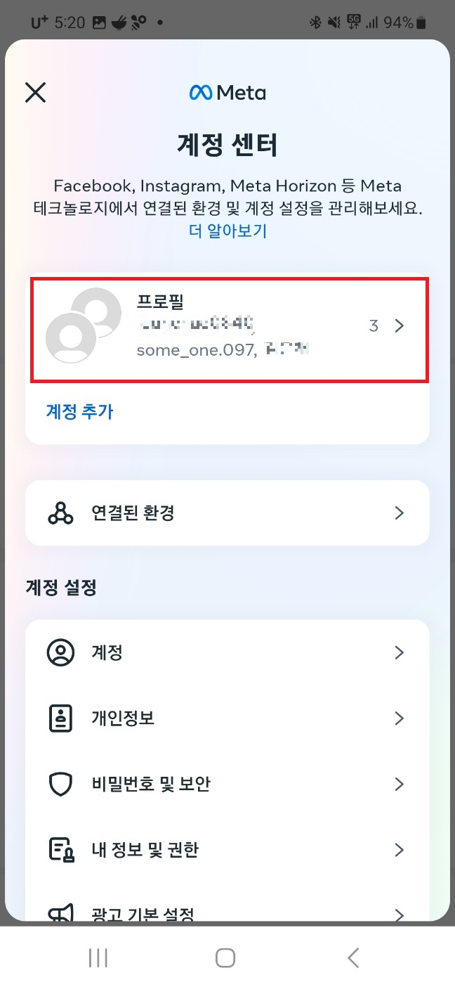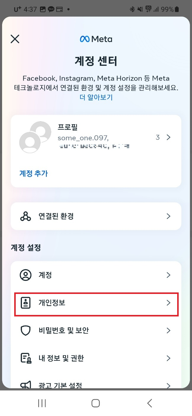 계정 센터를 클릭해주시고 개인정보에 들어가주세요.