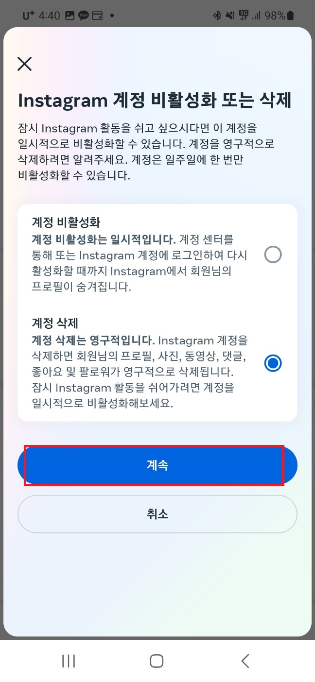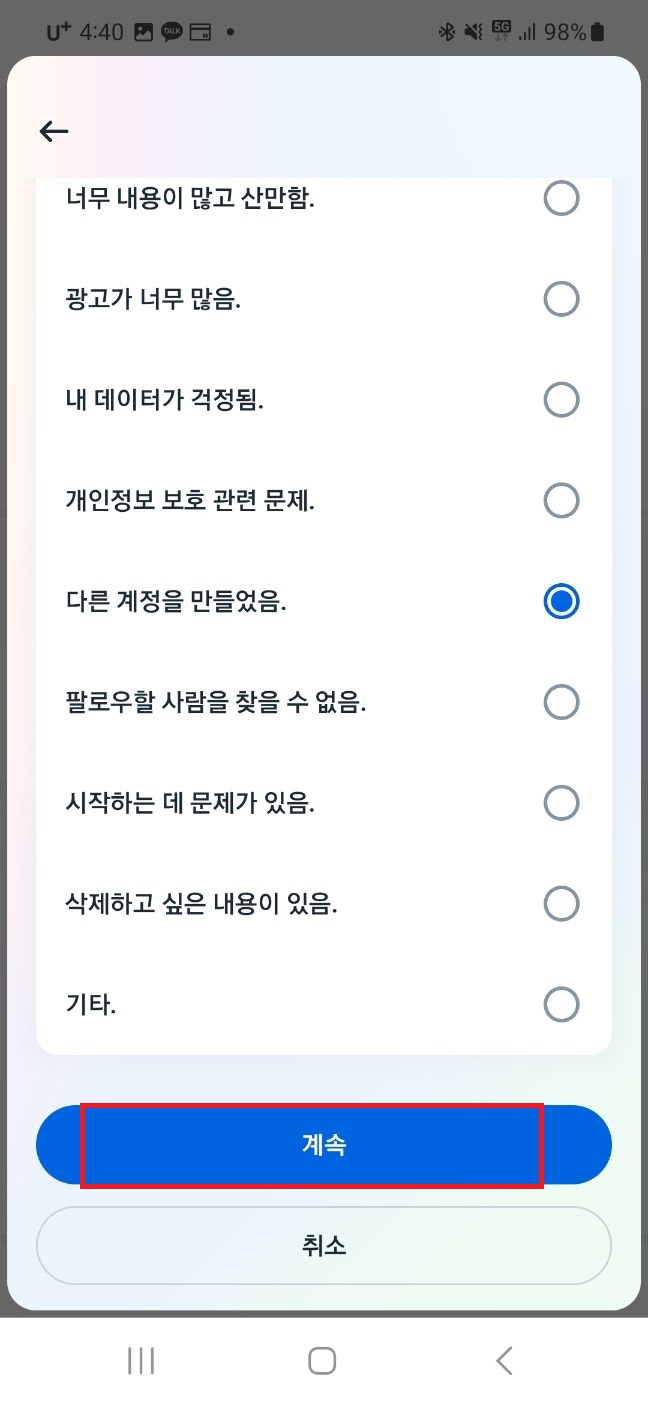 아래로 스크롤하시고 계정 삭제 이유를 선택해준 후 계속을 눌러주세요.