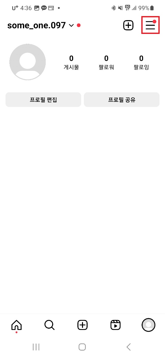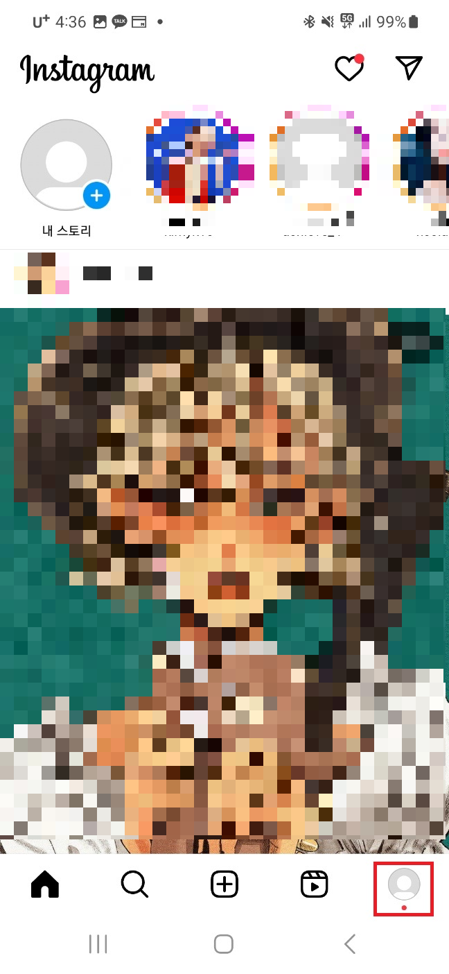 인스타 어플을 실행해주시고 우측 하단 프로필을 클릭해 내 피드로 들어가주세요.