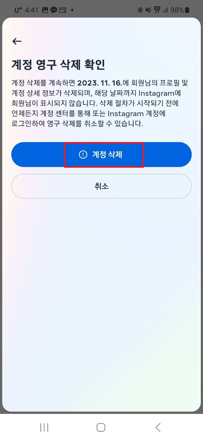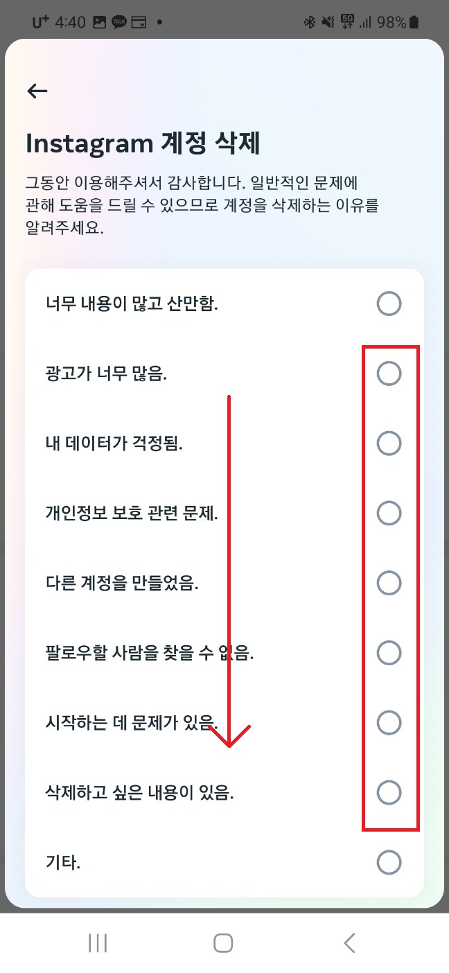 아래로 스크롤▶계정 삭제 이유 선택▶계속