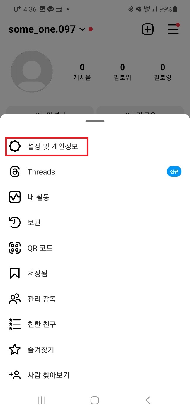 우측 상단 선 세개▶설정 및 개인정보