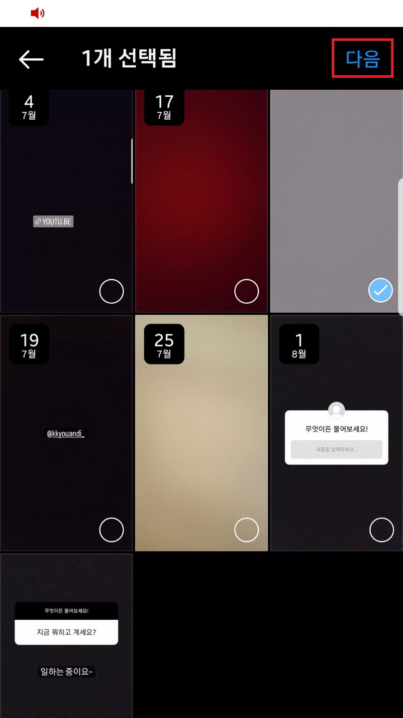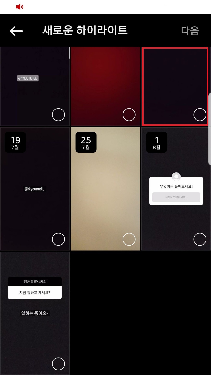 하이라이트에 추가할 스토리를 선택해주시고 다음을 눌러주세요.