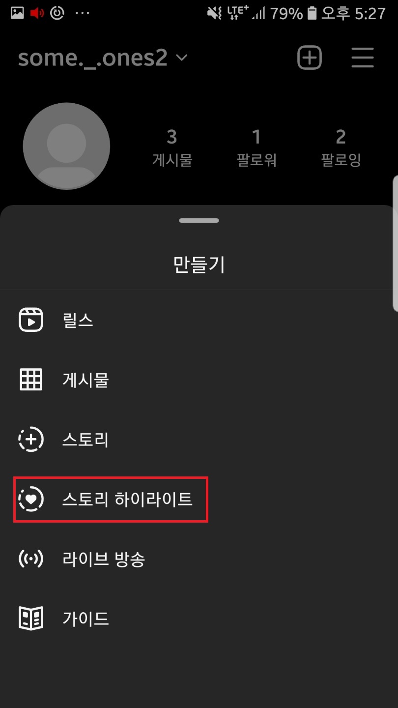 상단 +버튼을 눌러주신 후 스토리 하이라이트를 클릭해주세요.