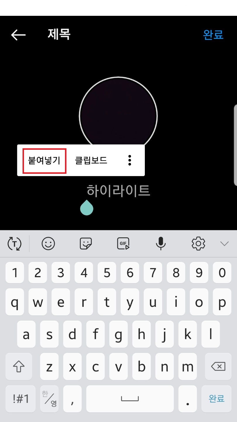 하이라이트라고 써져 있는 부분을 길게 눌러주면 메뉴가 뜨는데 여기서 붙여넣기를 클릭해주시면 공백이 붙여넣어져요! 여기서 완료를 눌러주시면 된답니다.