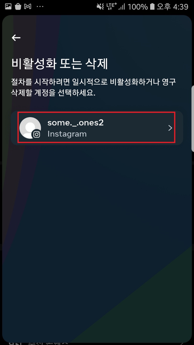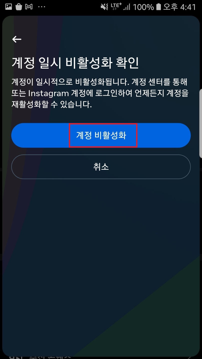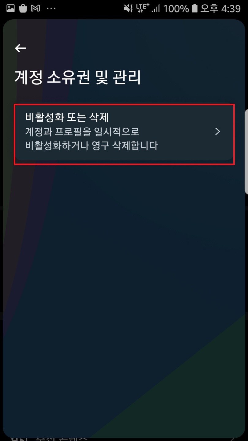 아래로 스크롤 ▶ 계속 ▶ 계정 비활성화