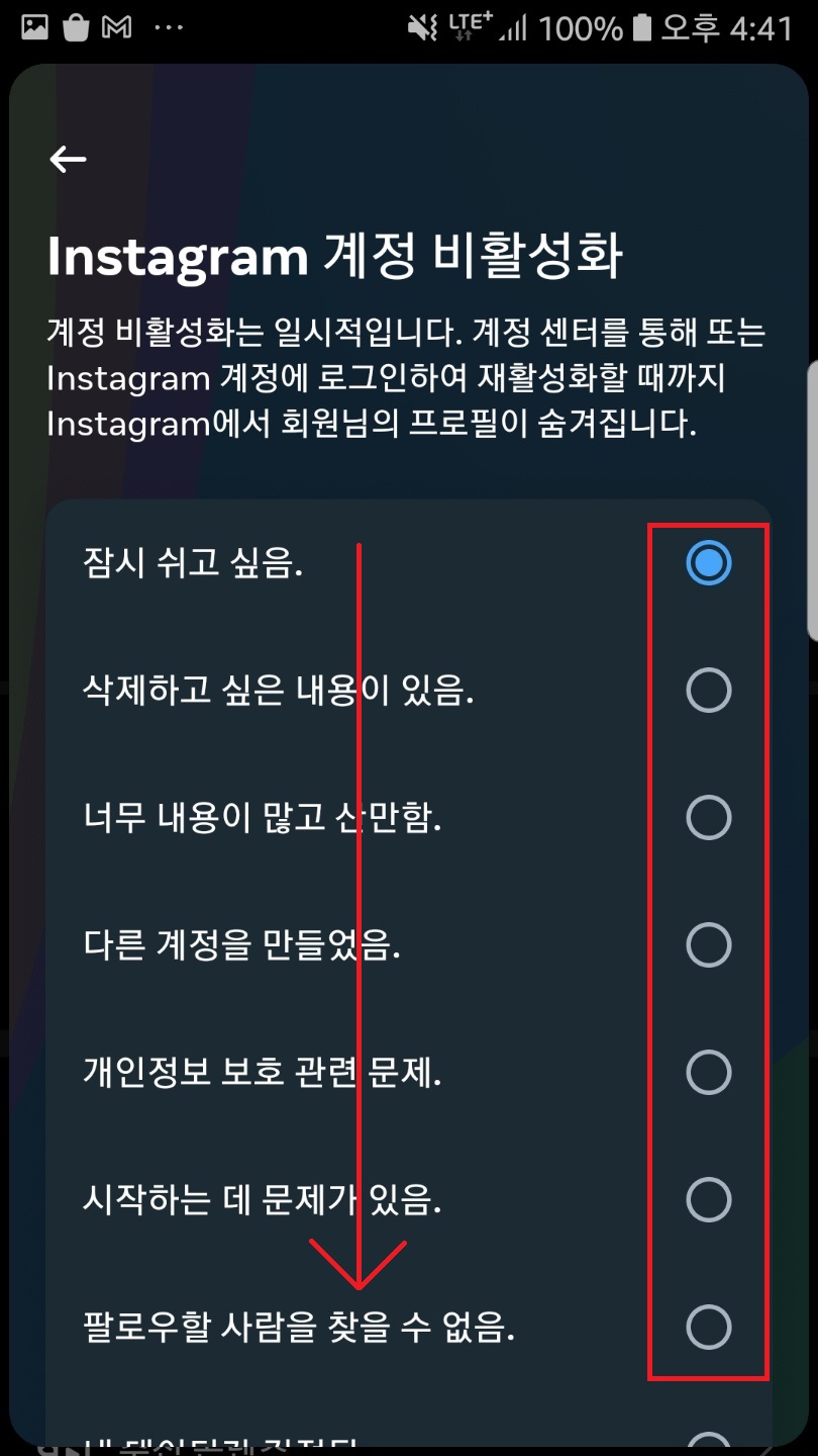 비활성화를 하는 이유를 선택하고 아래로 스크롤하여 계속을 눌러주세요.