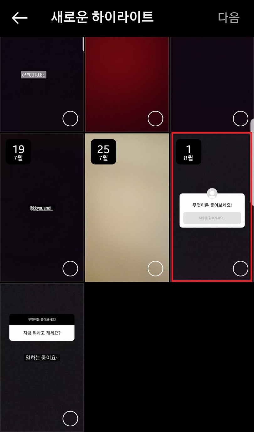 하이라이트에 추가할 스토리를 선택하신 후 다음을 눌러주세요.