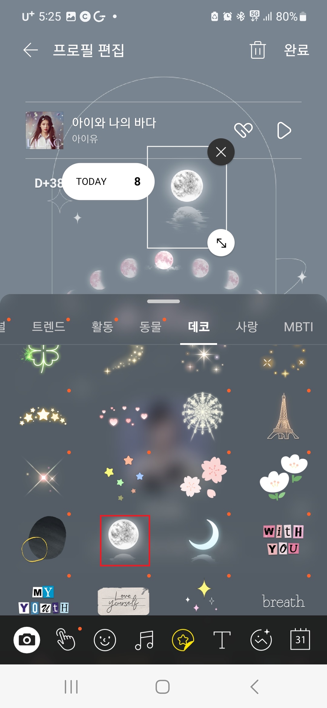배경사진을 추가하지 않아도 프로필 편집에서 하단 메뉴 중 스티커 아이콘을 선택하면 다양한 스티커를 사용할 수 있어요!