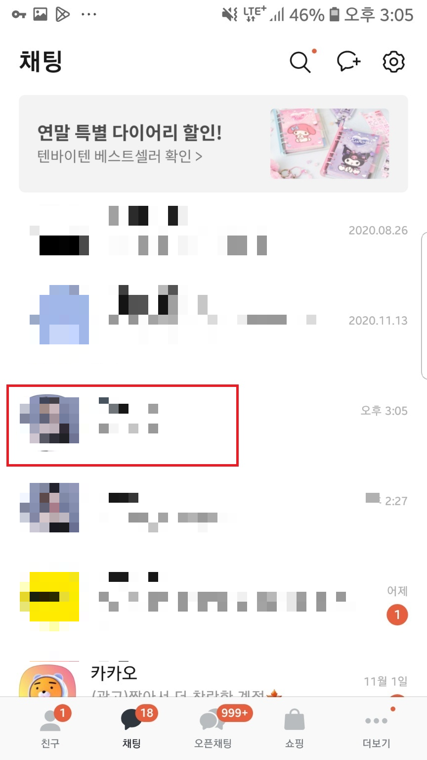 카톡을 실행해주시고 채팅 탭에 들어가주세요.