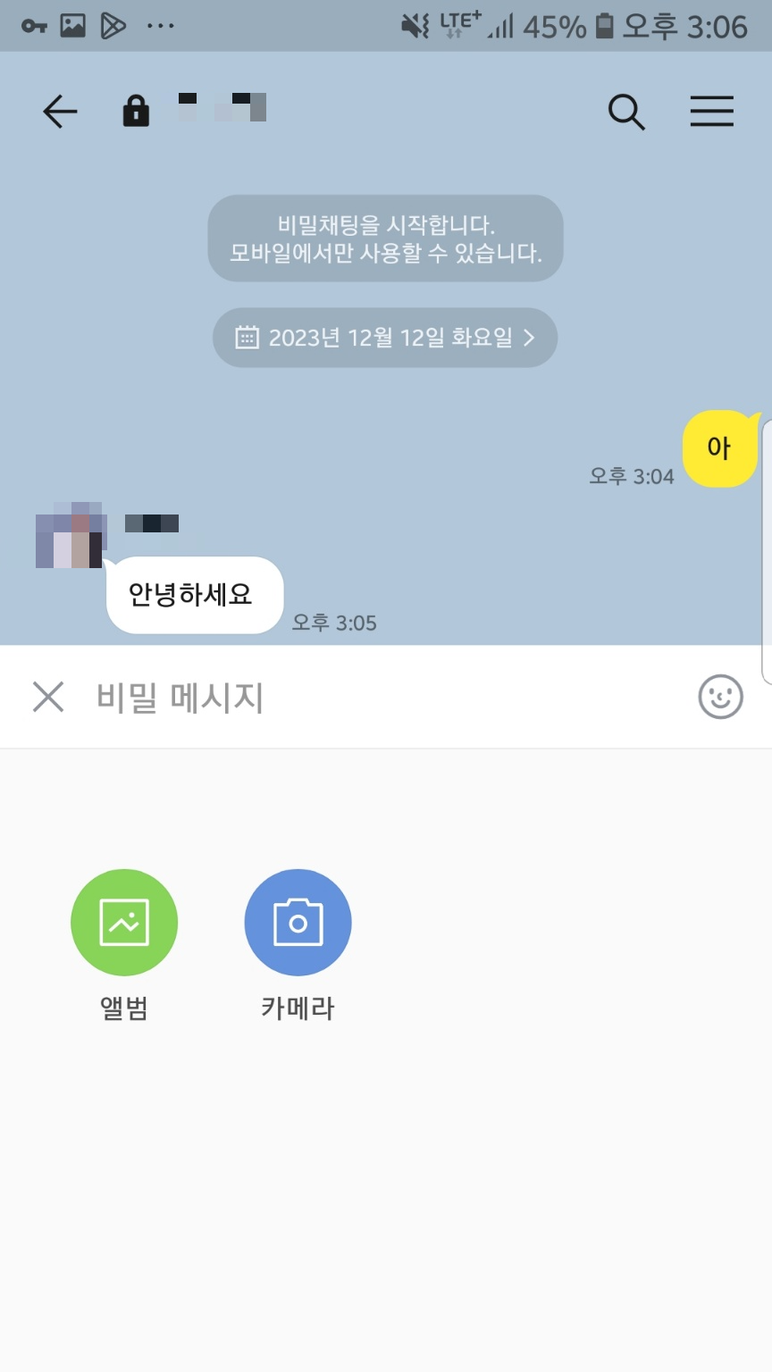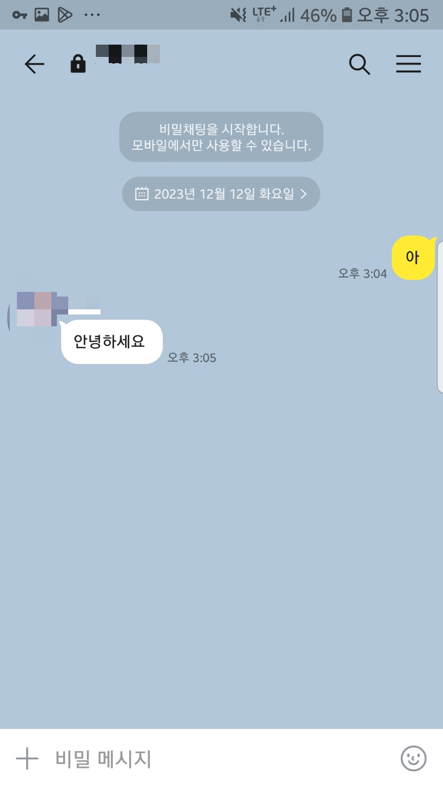 비밀채팅을 시작하면 채팅방이 따로 만들어지고, 확인해보면 '비밀 메시지'라고 뜨며 주고받은 메시지는 채팅방에 들어가야지만 보여요!