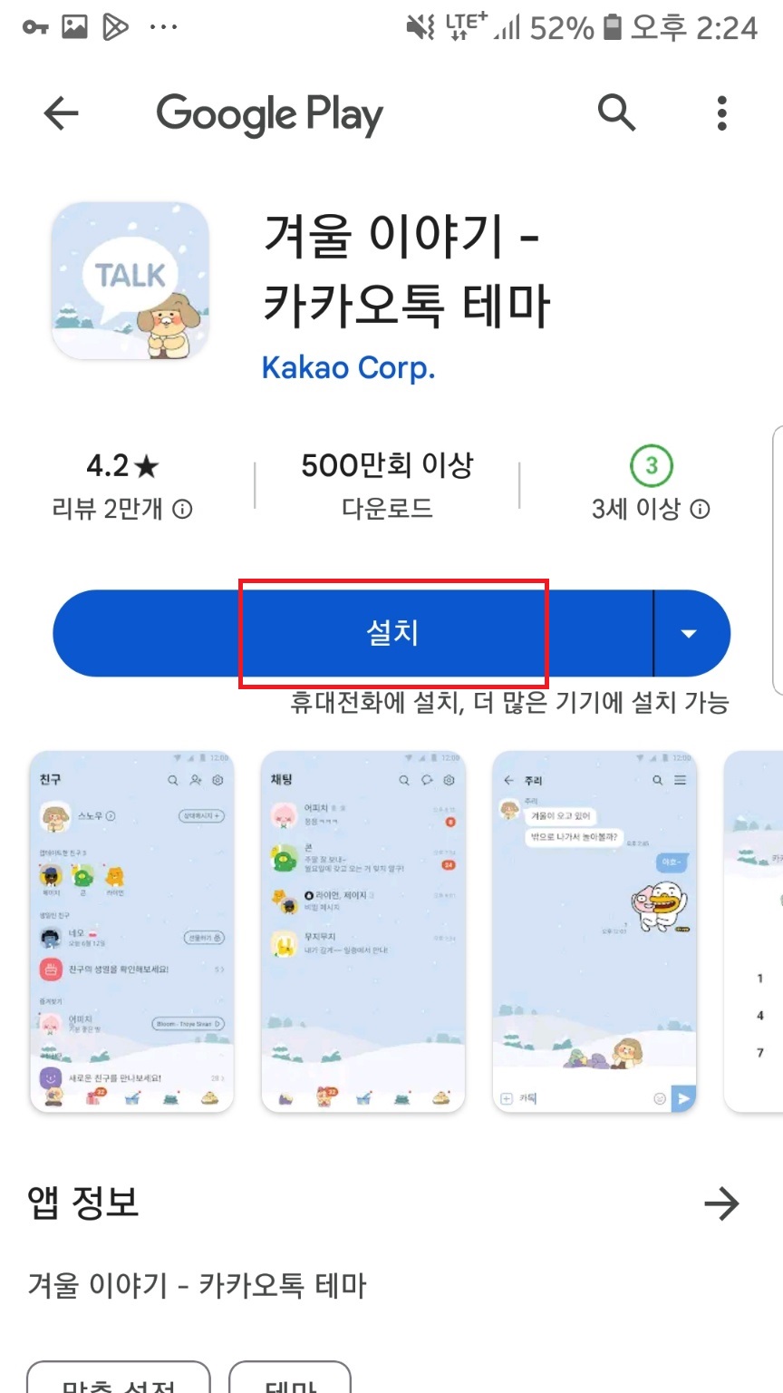 자동으로 열린 설치 창에서 설치를 눌러주세요. 설치가 끝나면 다시 카톡창으로 돌아가 우측 동그라미를 눌러 적용시켜주세요.