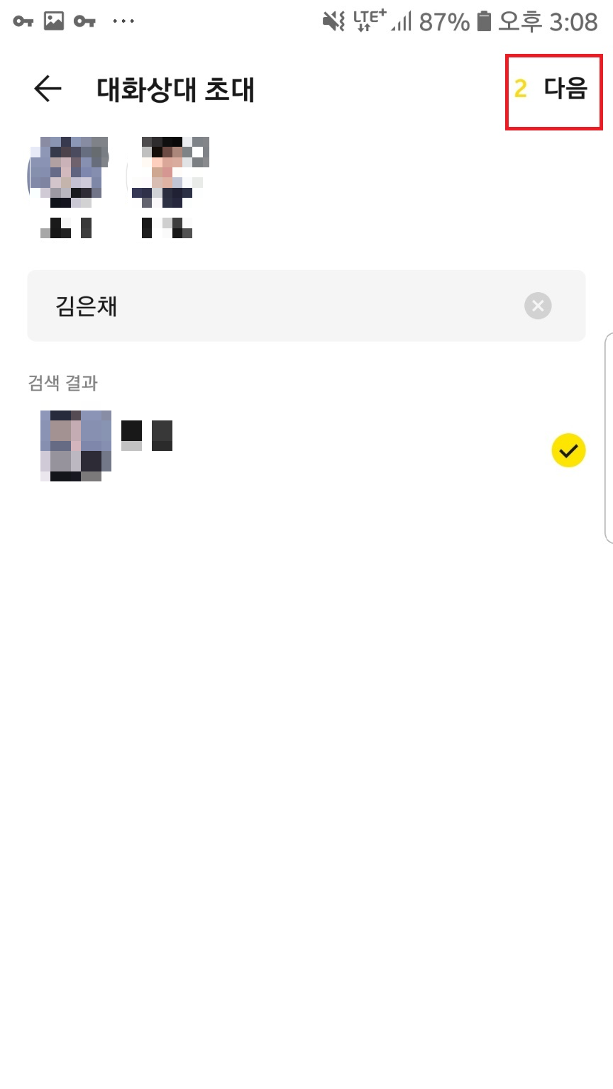 대화에 초대할 친구를 선택하고 우측 상단 다음 버튼을 눌러주세요. 이때 2명 이상 초대해주셔야 단톡방이 만들어진답니다.